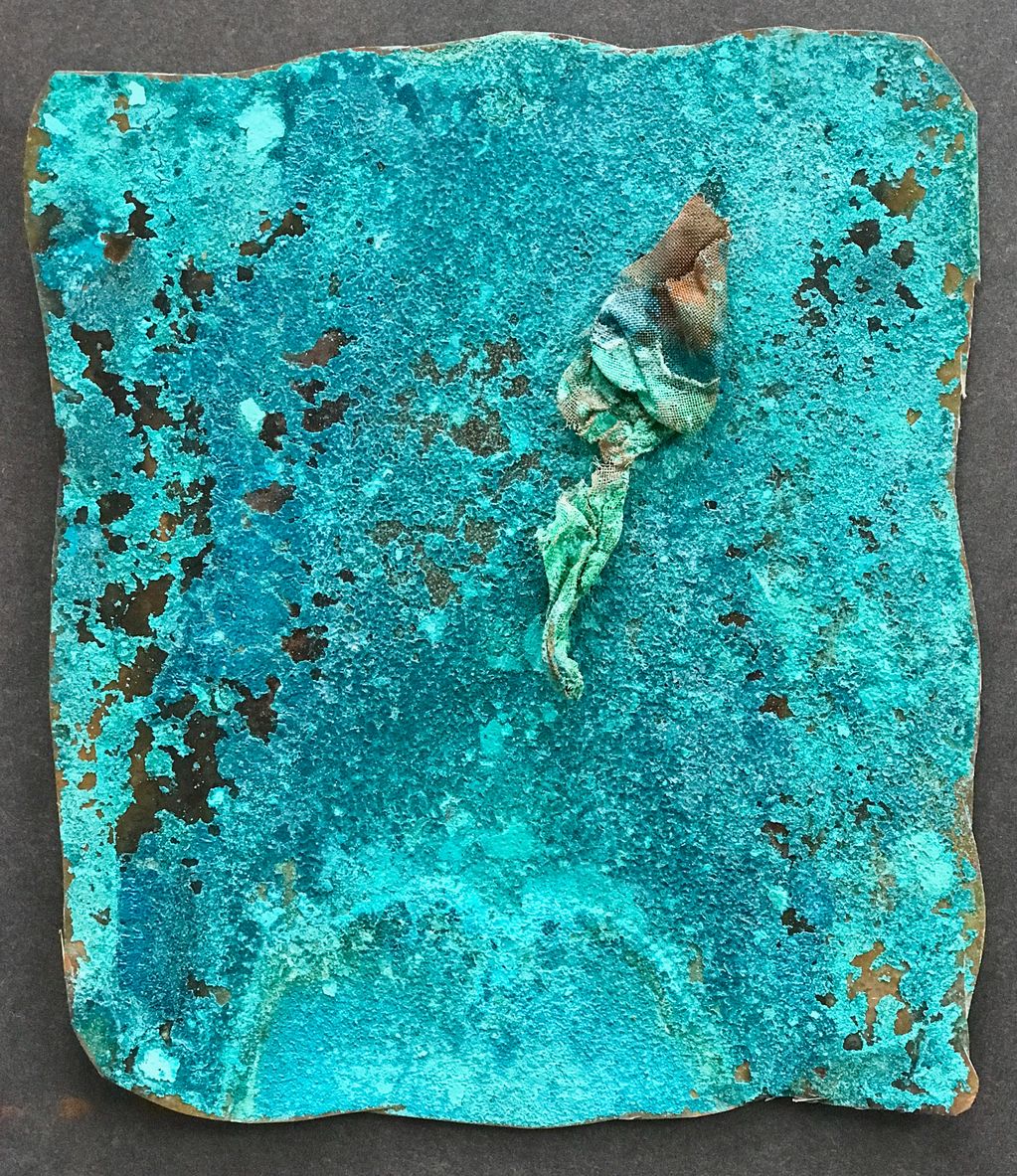 The current series of two dimensional verdigris artworks contain mixed media, small verdigris fragments and volcanic particles along with etchings, inks and oil paint.