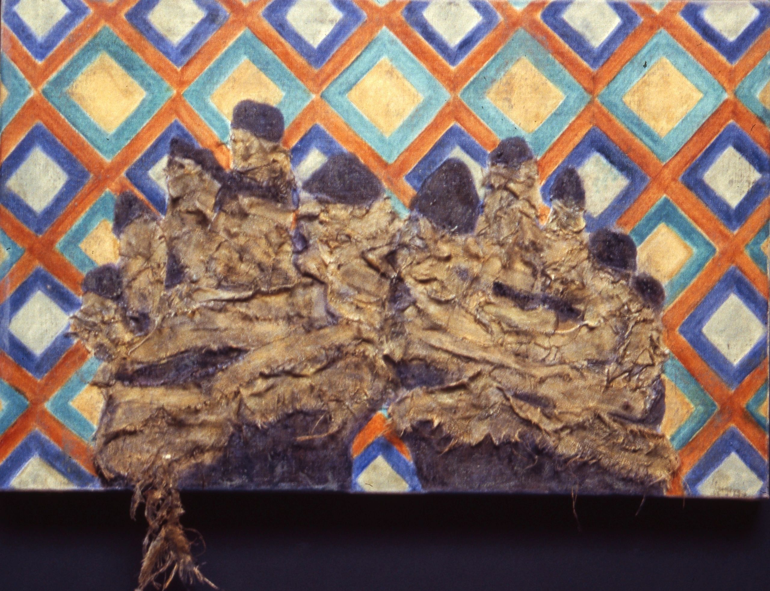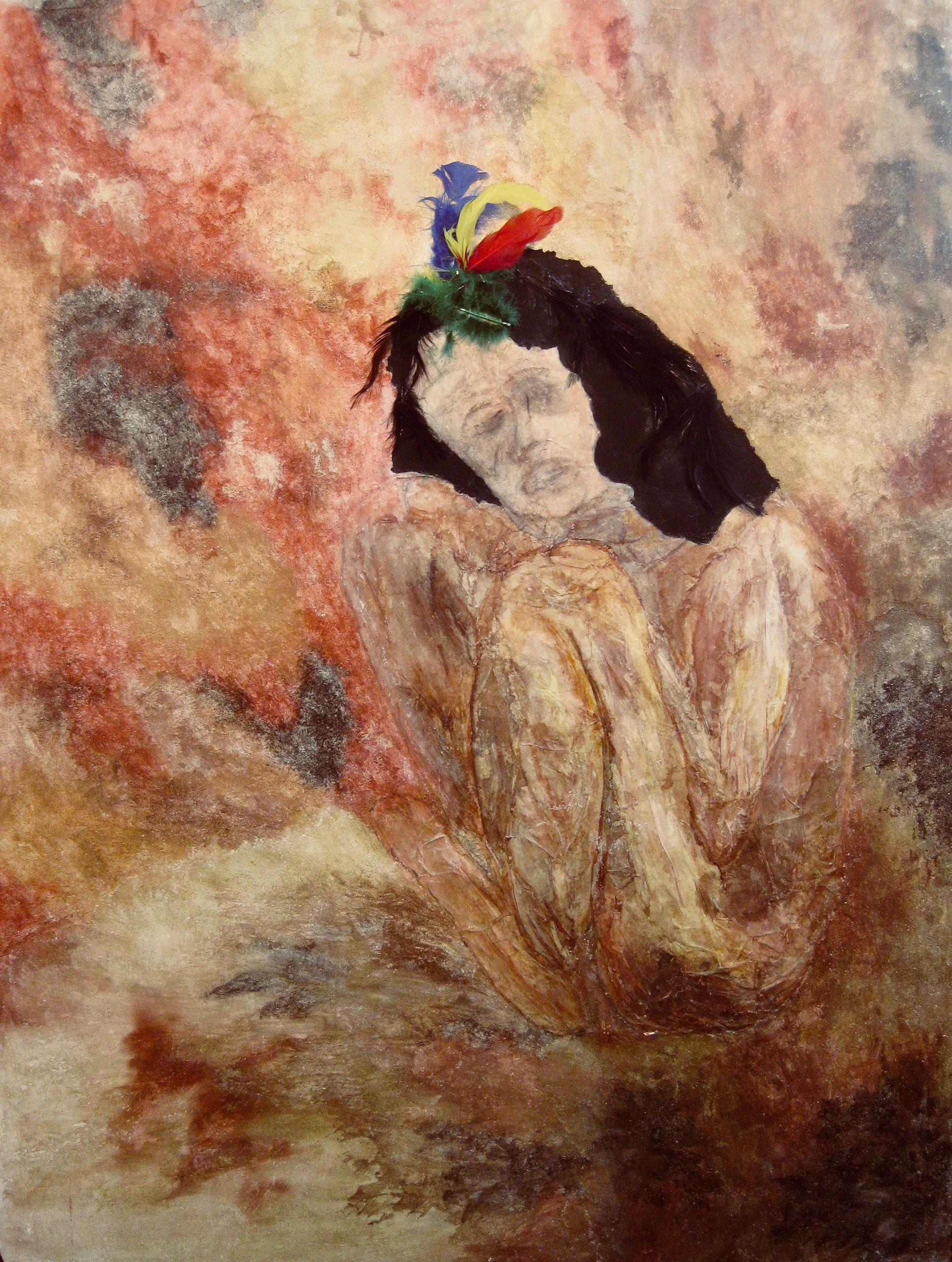 Fresco on mounted paper, cast paper figure with 3 feathers - 40 x 30".jpg